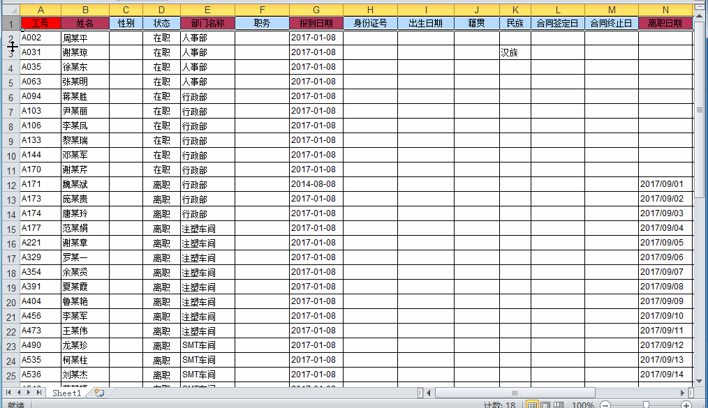 人事花名册导入,准备好人员的花名册,excel第一行为数据标题,红色为必须项,其他项非必须,可以自己补充完整
